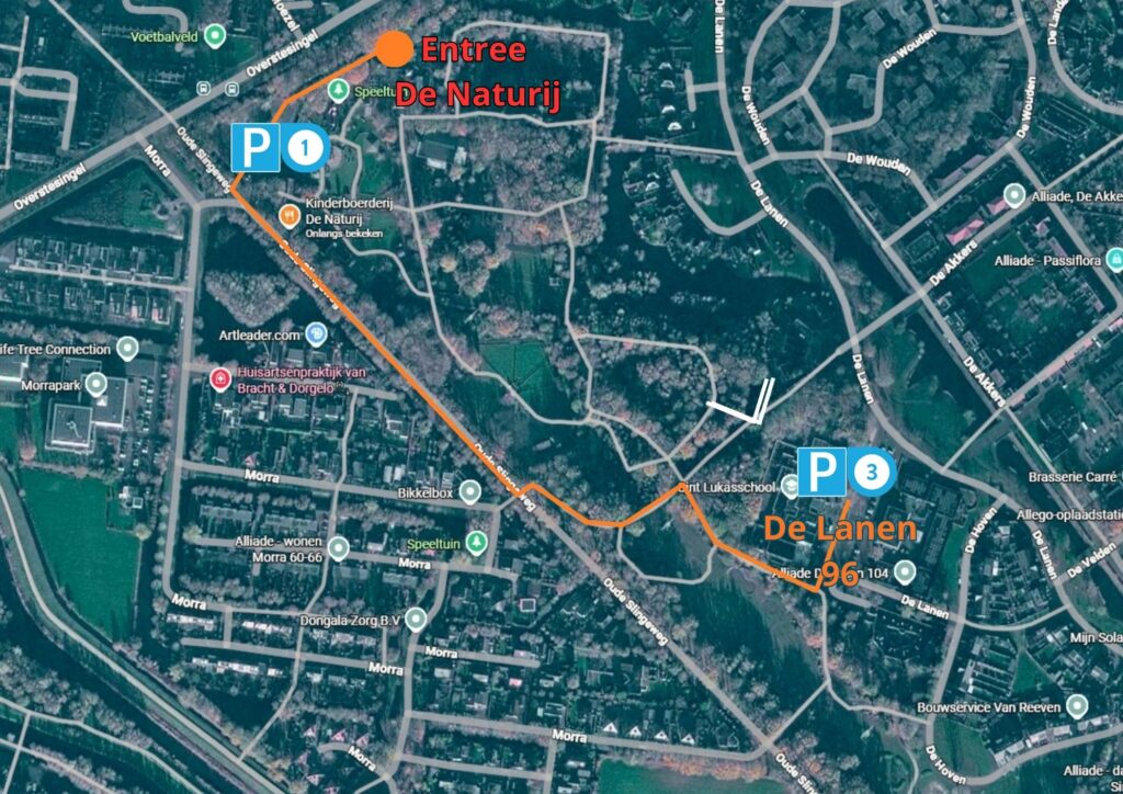 Is P1 vol? Parkeer dan op P3 (voor de navigatie: De Lanen 96). De oranje lijn op de kaart hieronder geeft de looproute naar het park aan. Op de busparkeerplaats naast P1 mag ook geparkeerd worden.