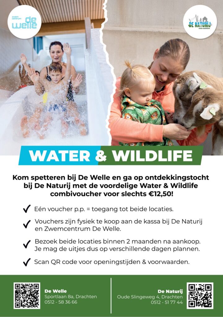 Zin in een dag vol plezier, avontuur én korting? Kom spetteren bij De Welle en ga op ontdekkingstocht bij De Naturij met de Water & Wildlife combivoucher voor slechts €12,50.